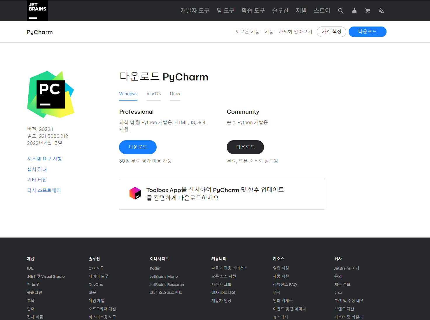 파이참은 아래 사이트에 가서 다운받아 설치한다.