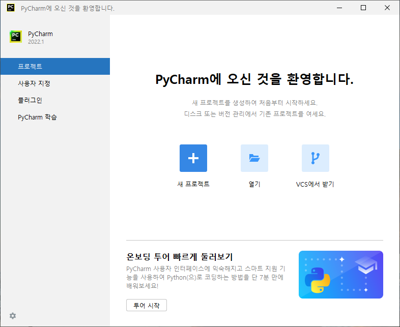 파이참을 실행하면 프로젝트를 생성하거나 기존 프로젝트를 추가할 수 있는 옵션이 있다.