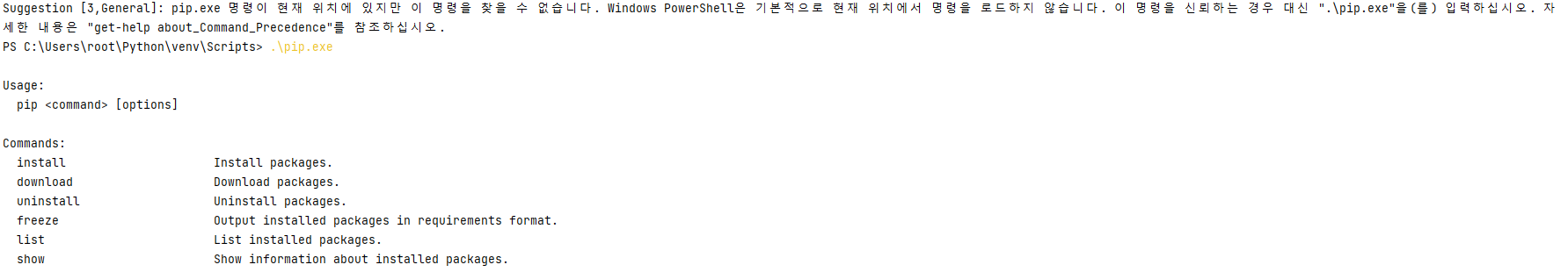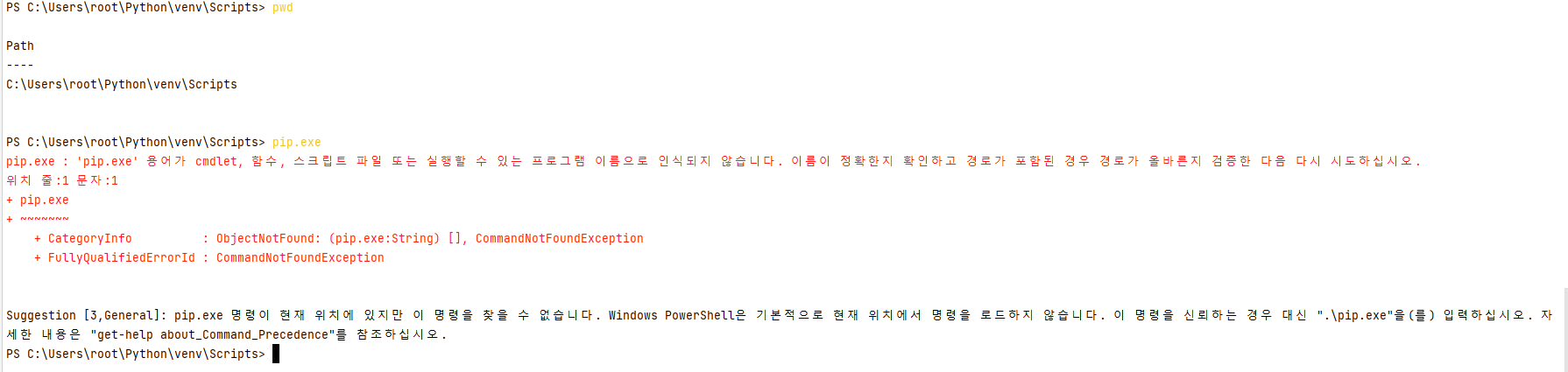 pip명령어를 찾을 수 없다는 메시지나 검증하라는 오류 메시지가 발생한다.