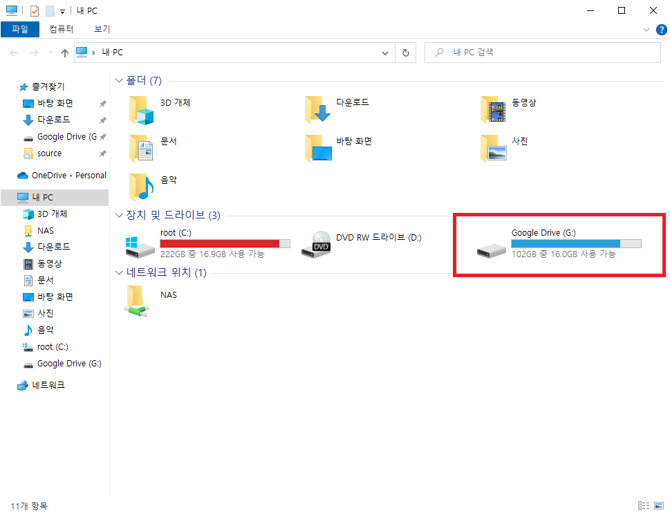 윈도우 탐색기에서 G드라이브가 보여야 한다.