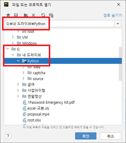 위 단계에서 구글 드라이브에 디렉토리를 생성했으므로 파이참 메뉴의 열기를 눌러