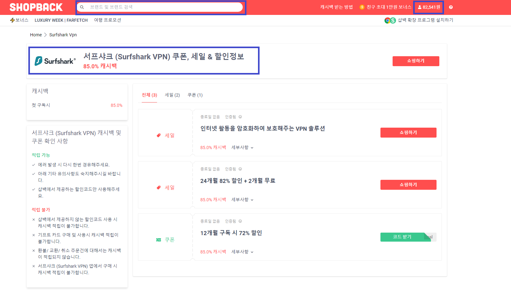 필자 역시 할인 + 캐시백 이벤트 기간에 surfshark 프로그램을 구매했다.