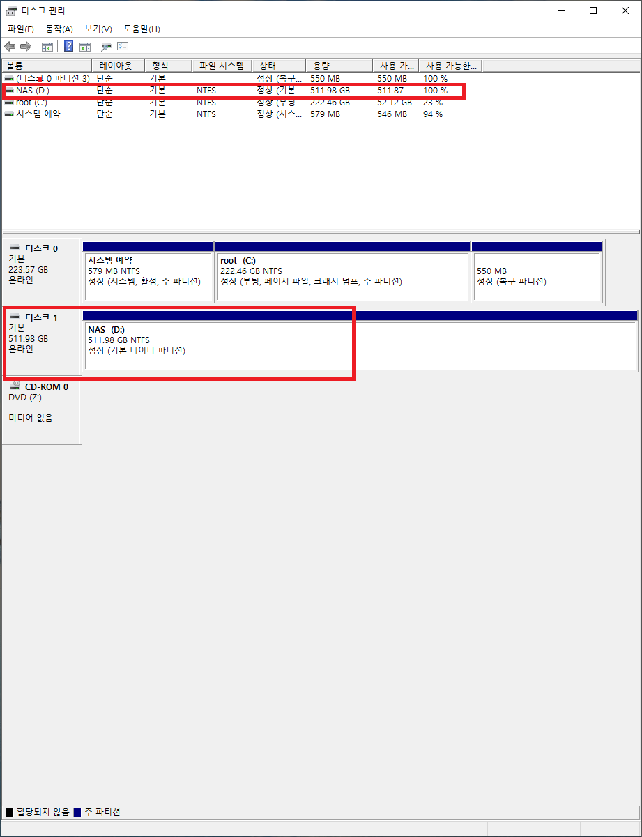 설정했던 드라이브명과 레이블명으로 추가된 디스크가 확인된다.