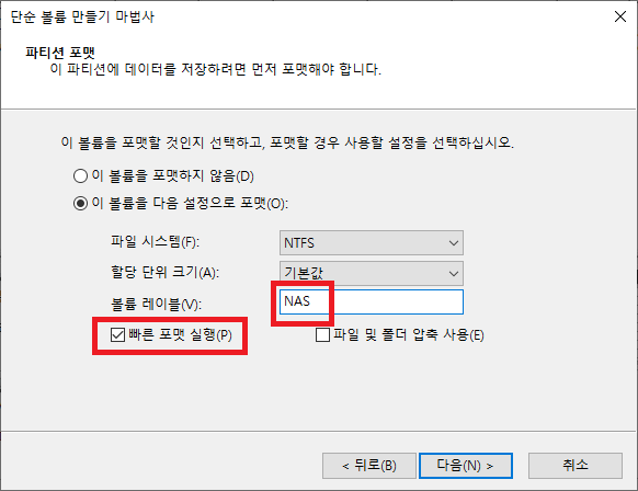 빠른 포맷으로 해당 디스크를 포맷한다.