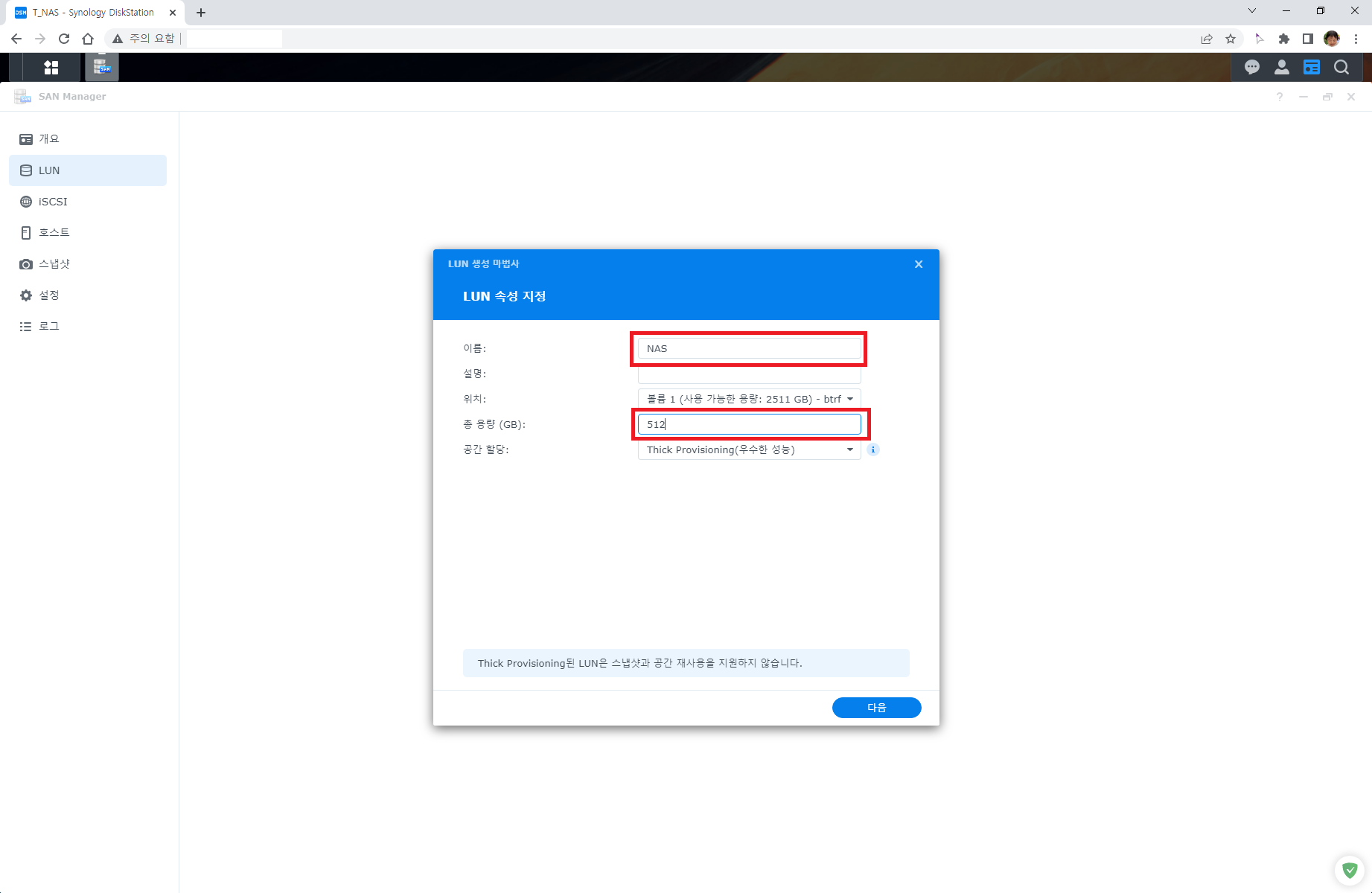 작성자는 이름은 NAS로 용량은 넉넉하게 512G로 설정했다.