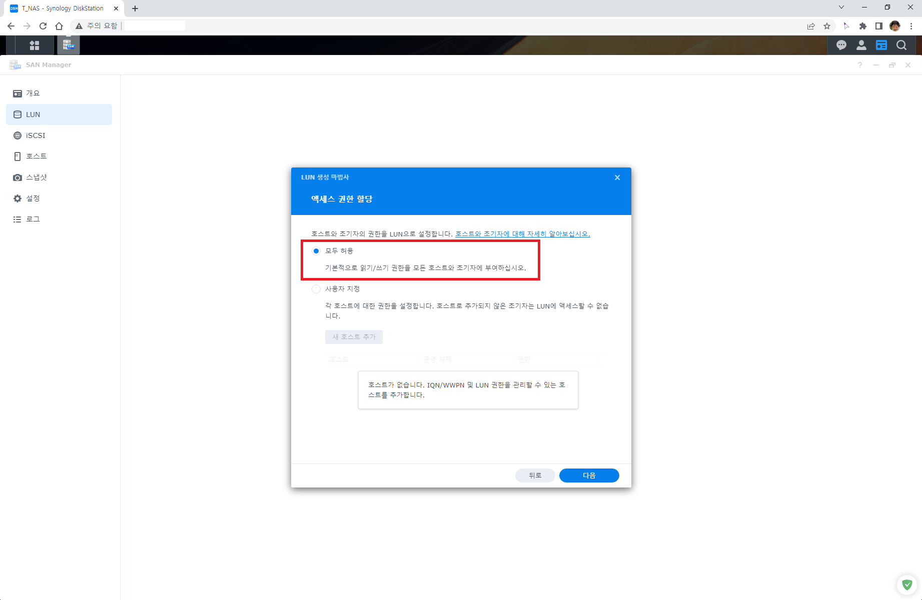 DSM이 신버젼이라면 자동으로 설정이 되어있고 구버젼이라면 생성한 LUN과 맵핑을 시켜줘야 한다.