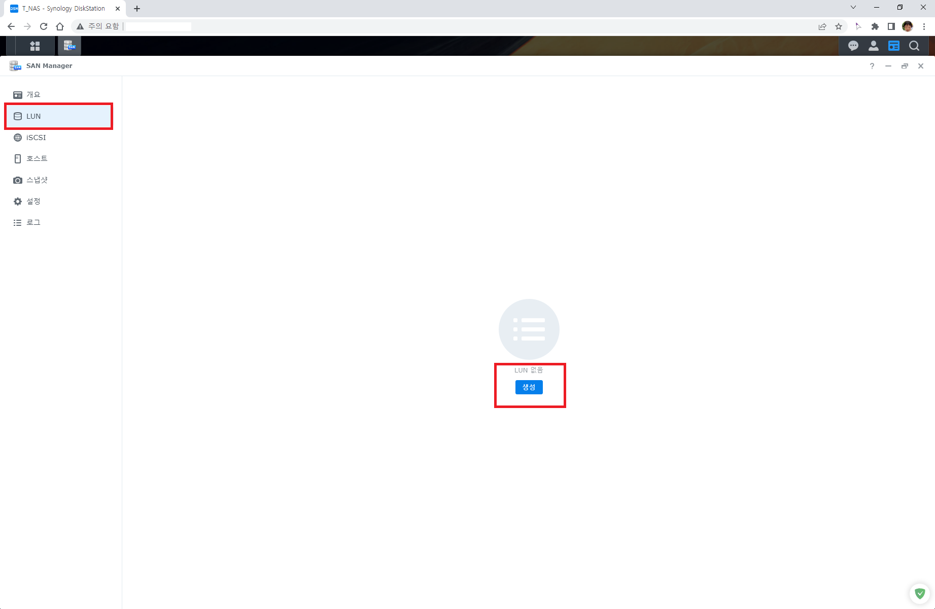 미리 LUN을 생성하지 않았다면 작성자처럼 생성 버튼만 보일것이고