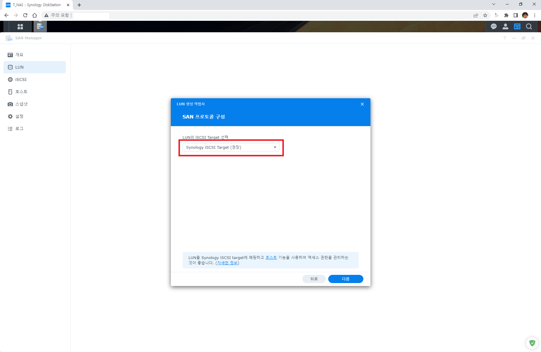 Synology DSM이 구버젼이라면 iSCSI Manger를 실행해야한다