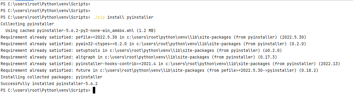 Successfully installed pyinstaller 메시지가 확인되면 정상적으로 설치가 된것이다.
