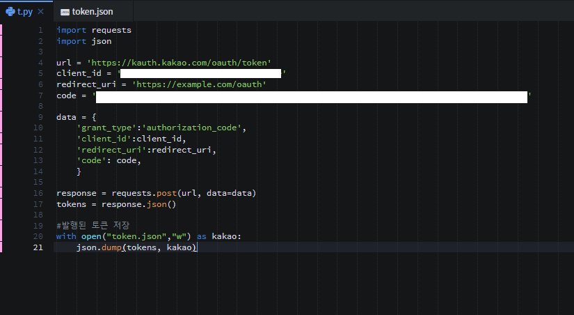 이제 파이썬 코드를 통해 카카오톡에 메시지를 보낼 수 있는 인증 토큰을 발급발고