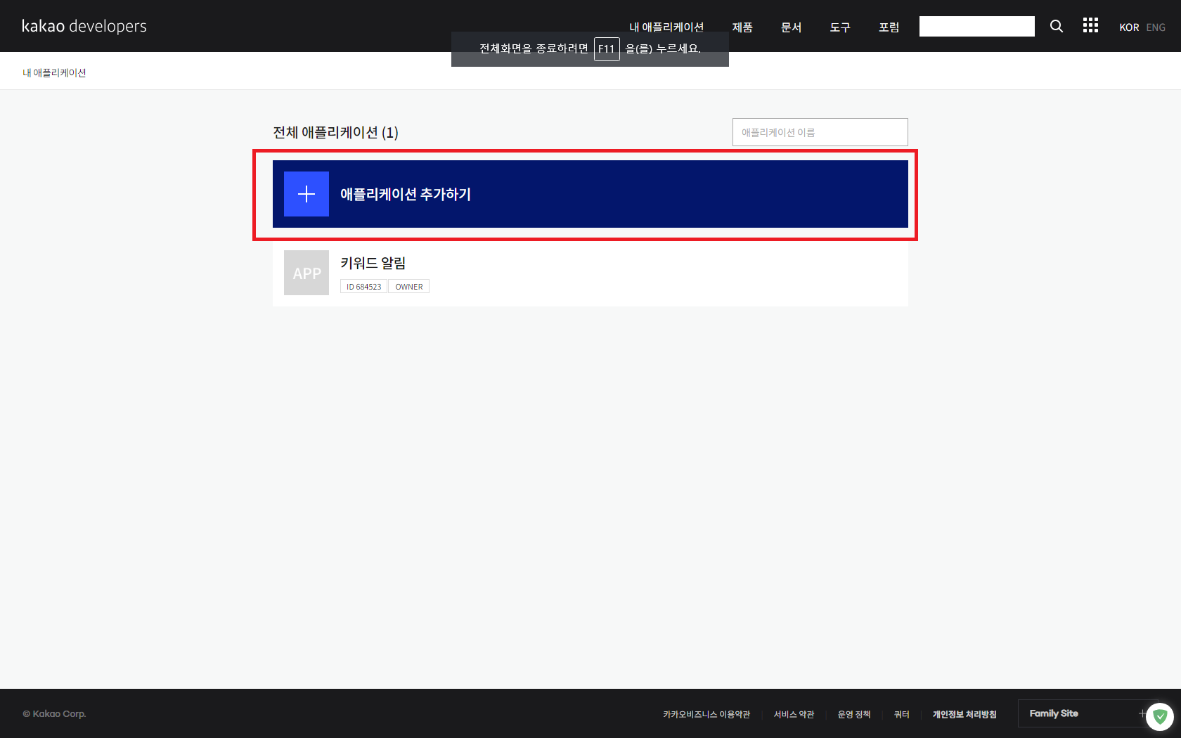 로그인 후 내 어플리케이션 항목을 눌러 화면을 이동한 후 어플리케이션 추가하기를 누른다.