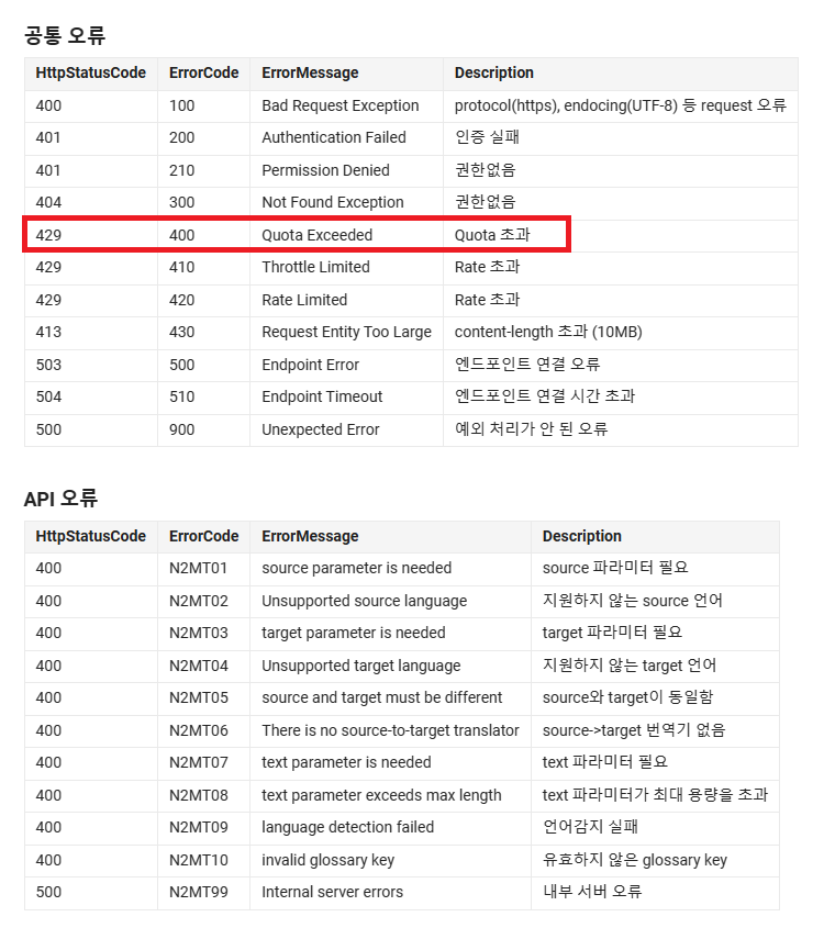 하루에 번역할 수 있는 양이 제한되어 있기 때문에 발생했던 에러 코드이다.