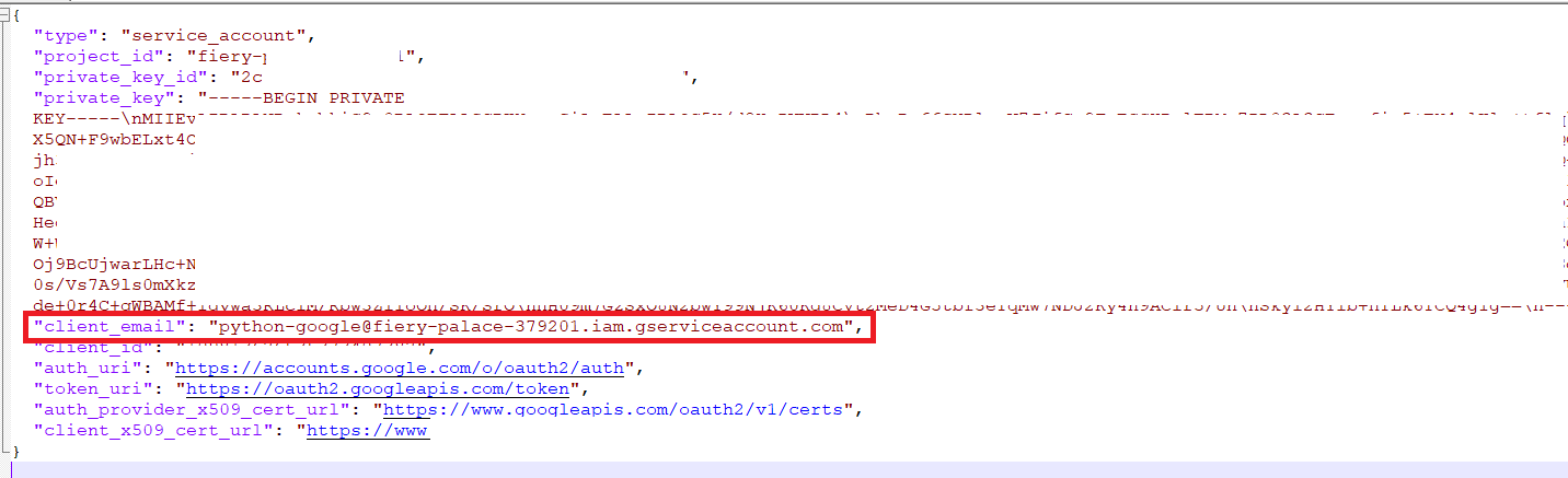 다운된 json 파일을 열어보면 "client_email" 이라는 항목을 확인 할 수 있다.