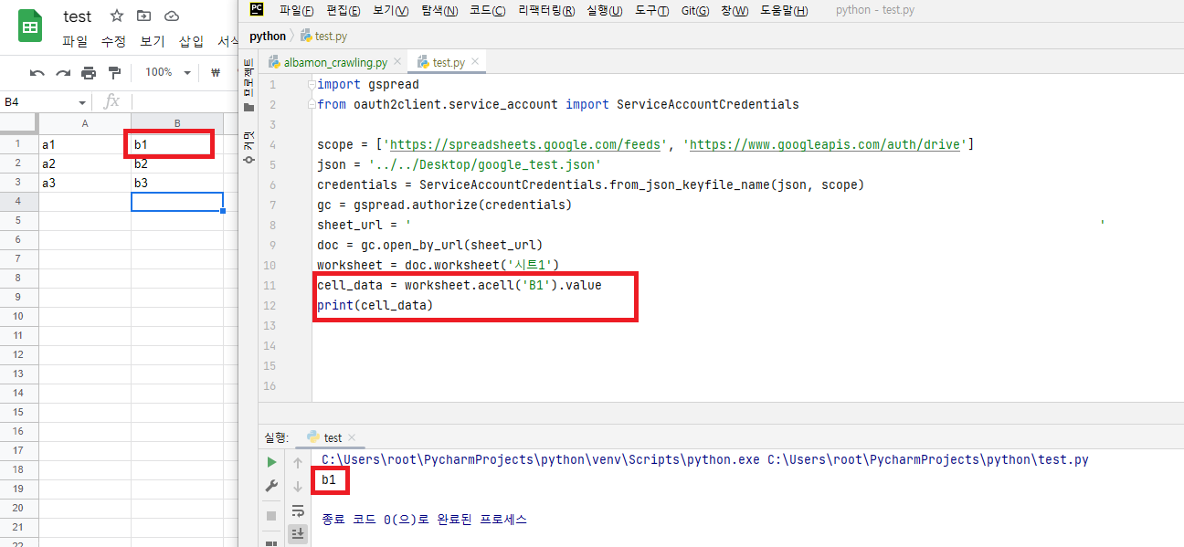 스프레드 시트의 b1 셀에 기입했던 값이 정상적으로 출력된다.