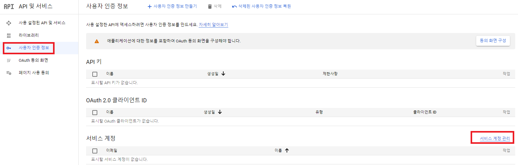 사용자 인증 정보 -> 서비스 계정 관리 -> 서비스 계정 만들기 버튼을 차례로 클릭한다.