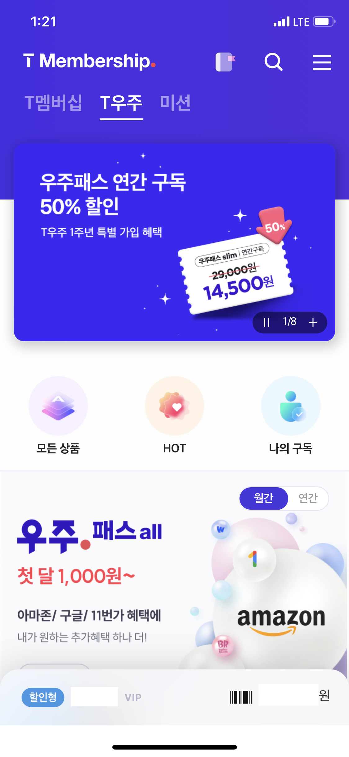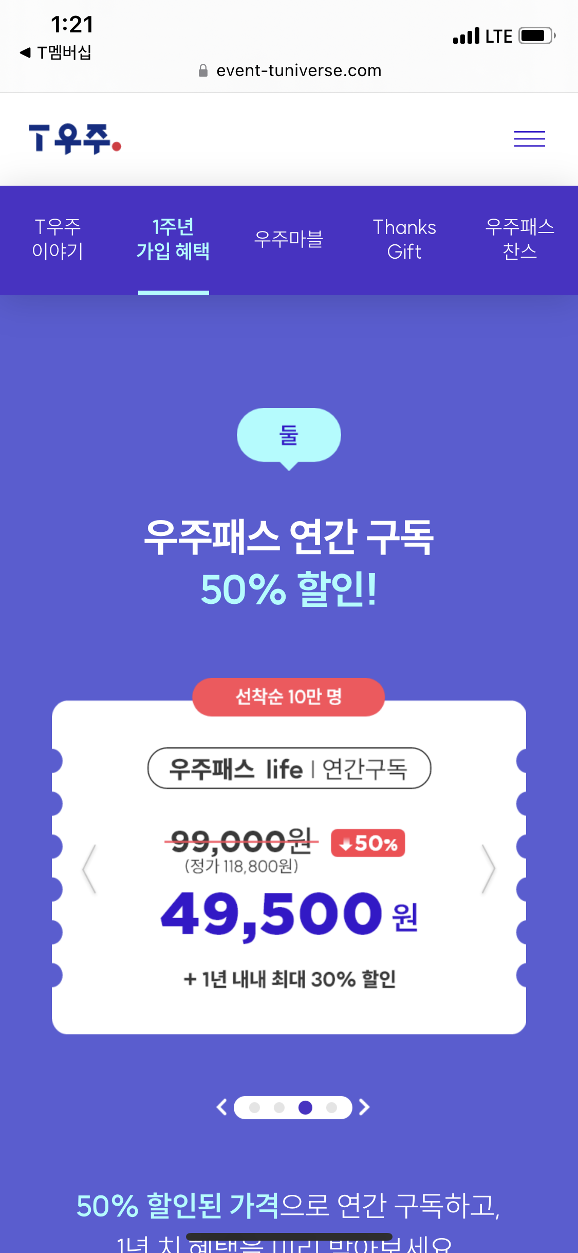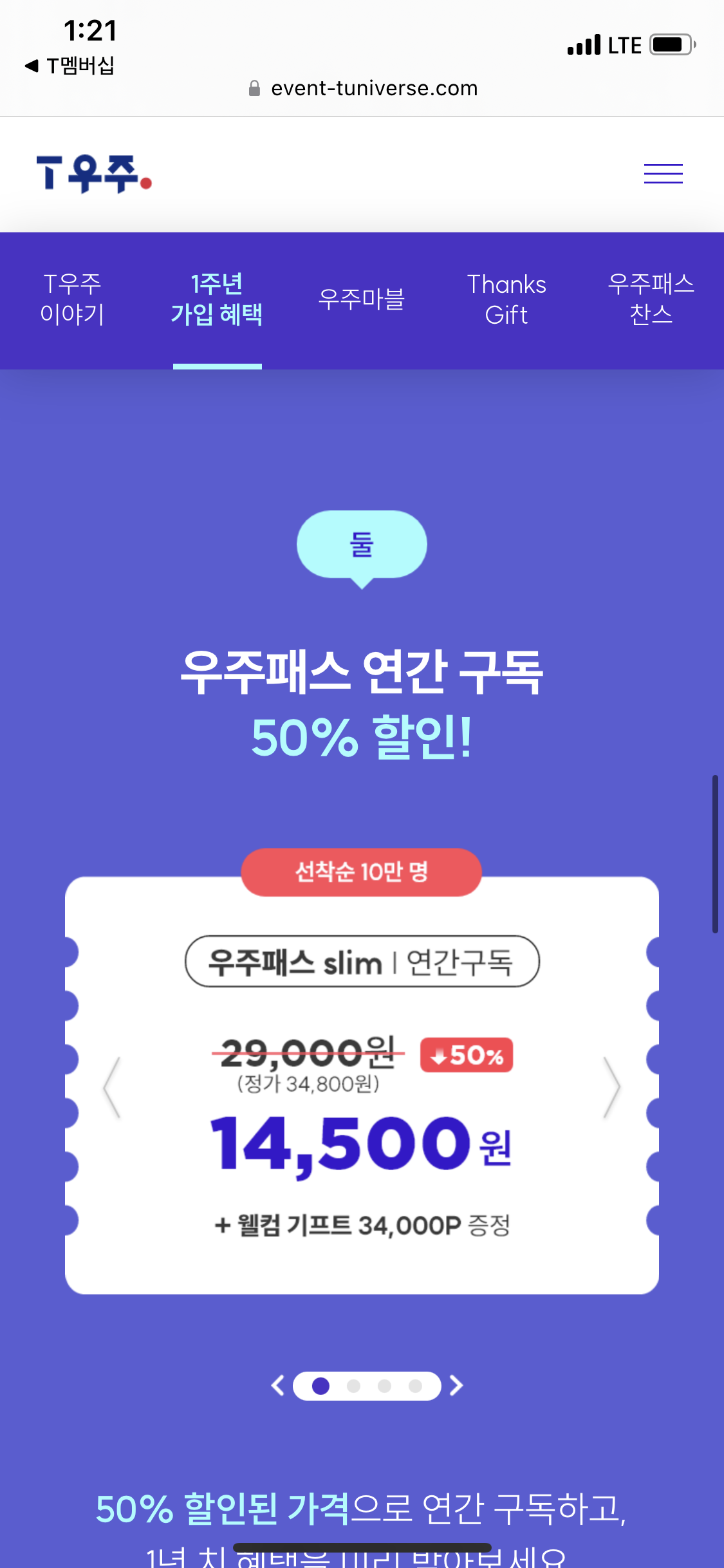 어플 실행 후 T우주 메뉴에 들어가면 상단의 배너에서 우주패스 연간 구독 이벤트를 확인 할 수 있다.