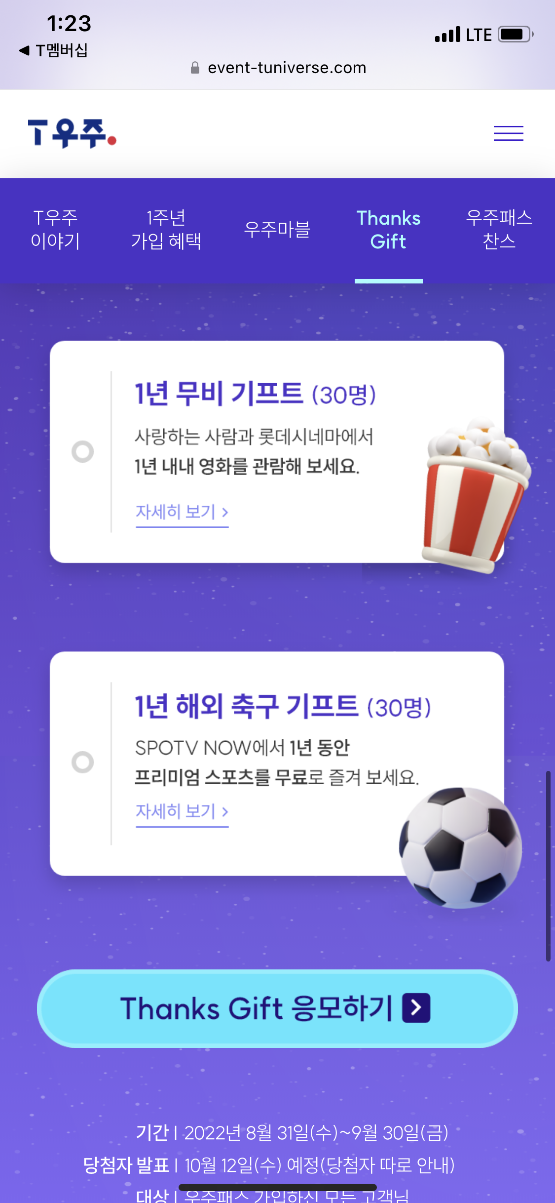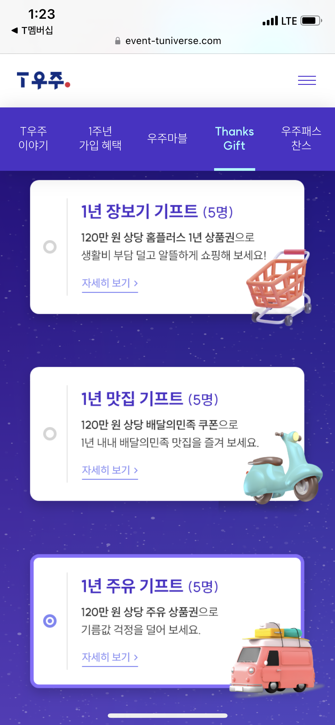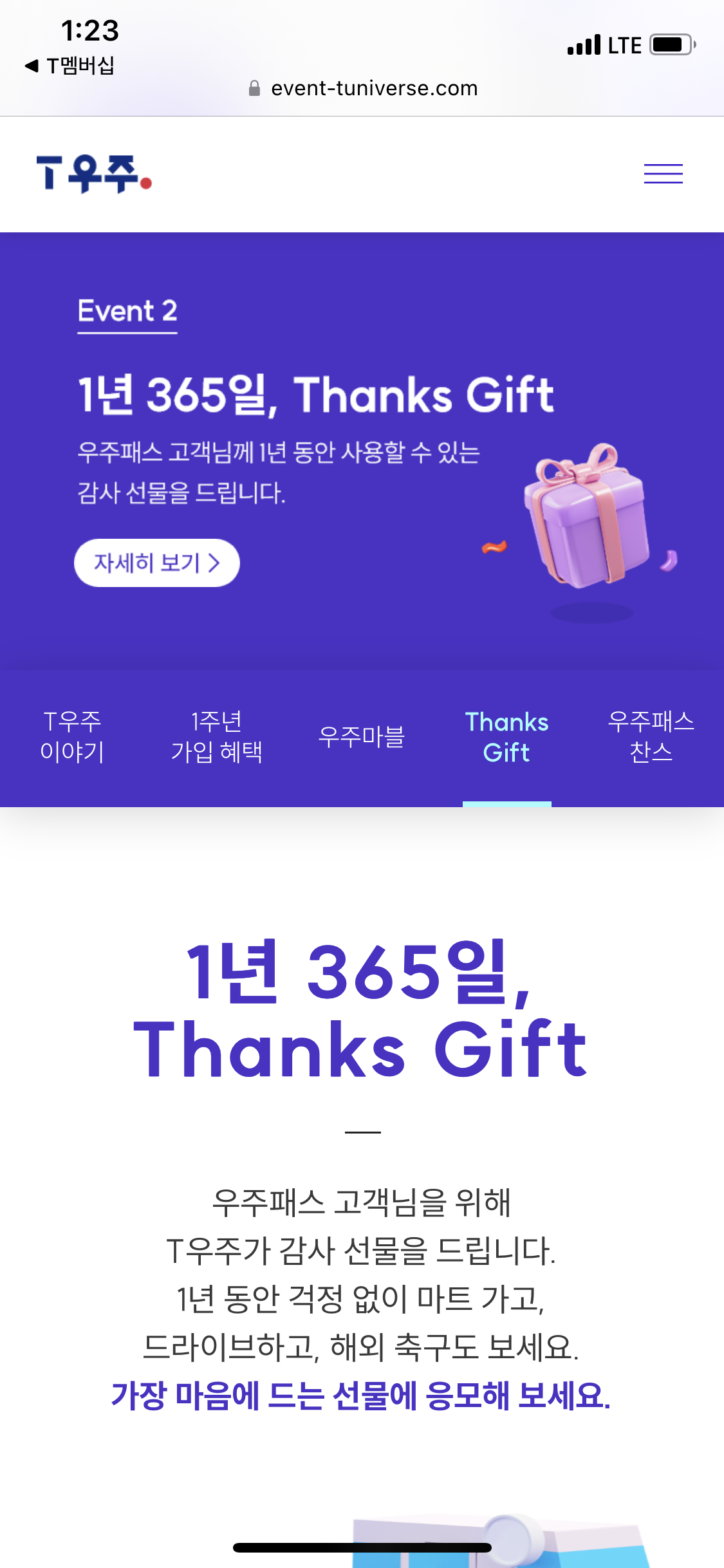 어플 실행 후 T우주 메뉴에 들어가면 상단의 배너에서 우주패스 연간 구독 이벤트를 확인 할 수 있다.
