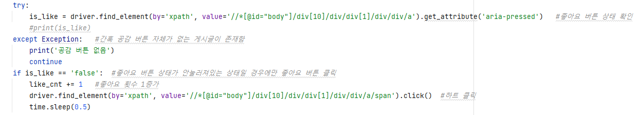 is_like = driver.find_element(by='xpath', value='//*[@id="body"]/div[10]/div/div[1]/div/div/a').get_attribute('aria-pressed') #좋아요 버튼 상태 확인