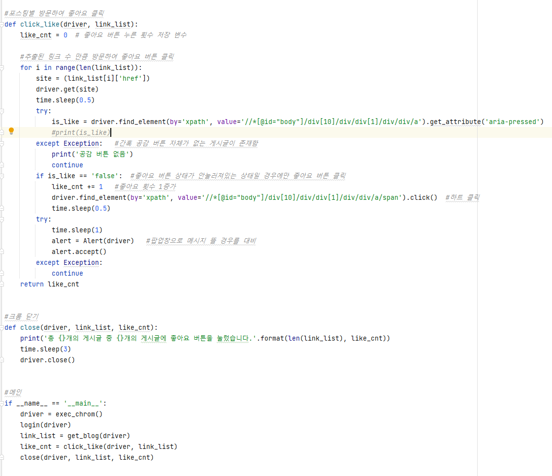 #추출된 링크 수 만큼 방문하여 좋아요 버튼 클릭