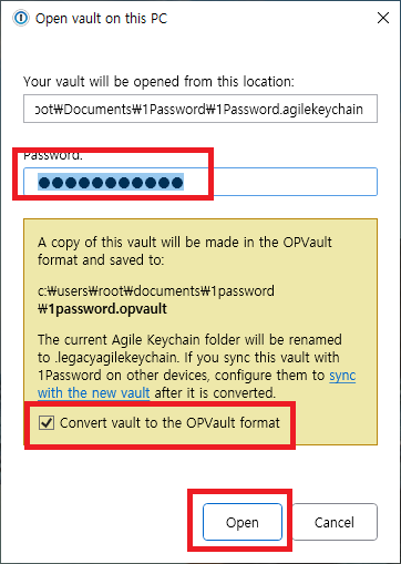 해당 폴더를 선택하고 마스터 패스워드를 입력 후 Conver 체크박스를 체크 한 후 Open 버튼을 눌러준다.