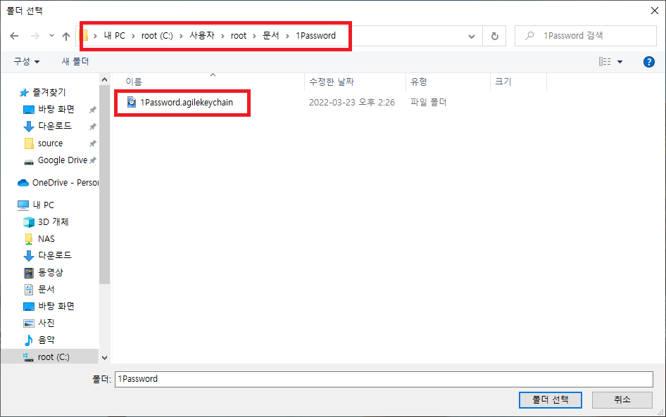 무료 버젼 1password 설치시 저장 위치로 설정했던 경로에 가면